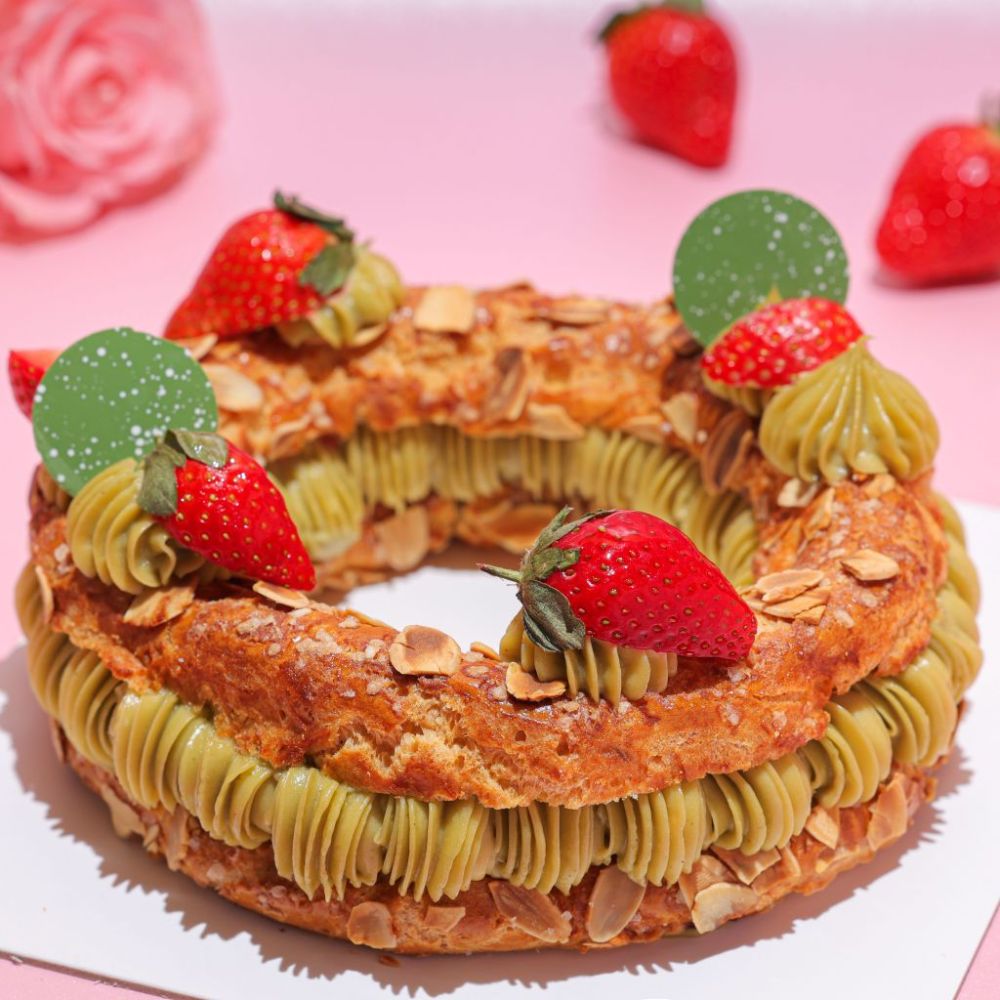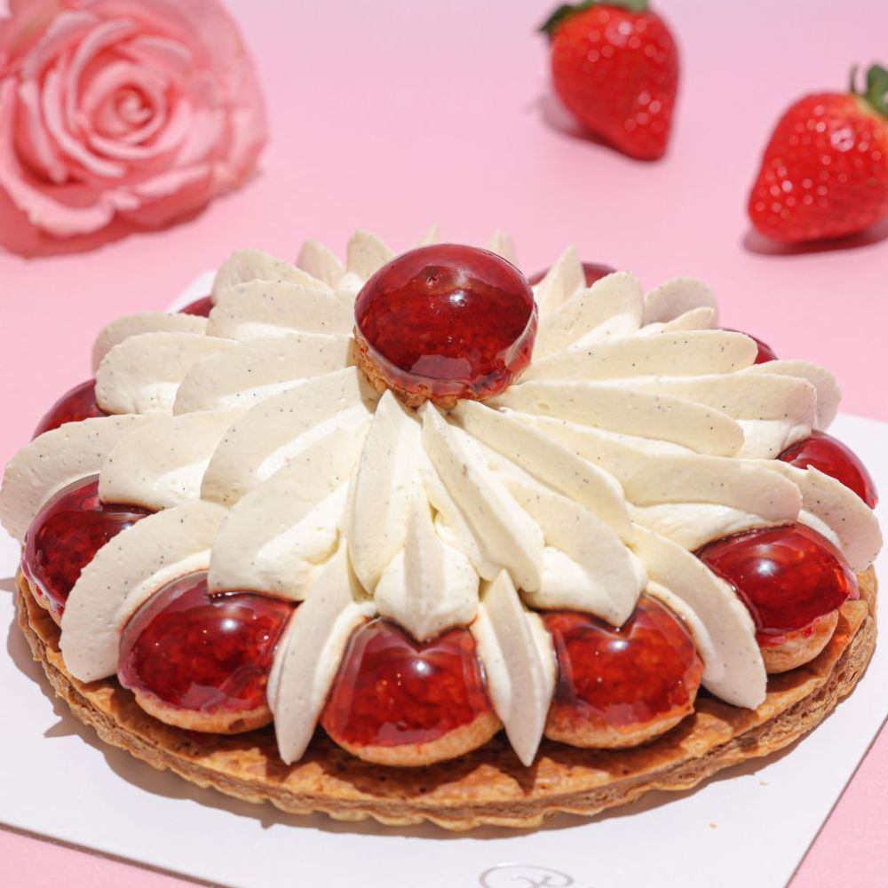 草莓聖安娜泡芙STRAWBERRYST. HONORÉ以焦糖酥皮與焦糖泡芙堆疊香草香緹、草莓醬與鮮草莓,展現正宗法式經典。法式經典草莓慕斯蛋糕FRAISIER結合手指餅乾海綿、香草慕斯林與整顆草莓,造型吸睛亮眼,口感輕盈滑順。另有草莓塔、草莓千層酥與草莓元寶等品項,香酥口感充滿過年意象。