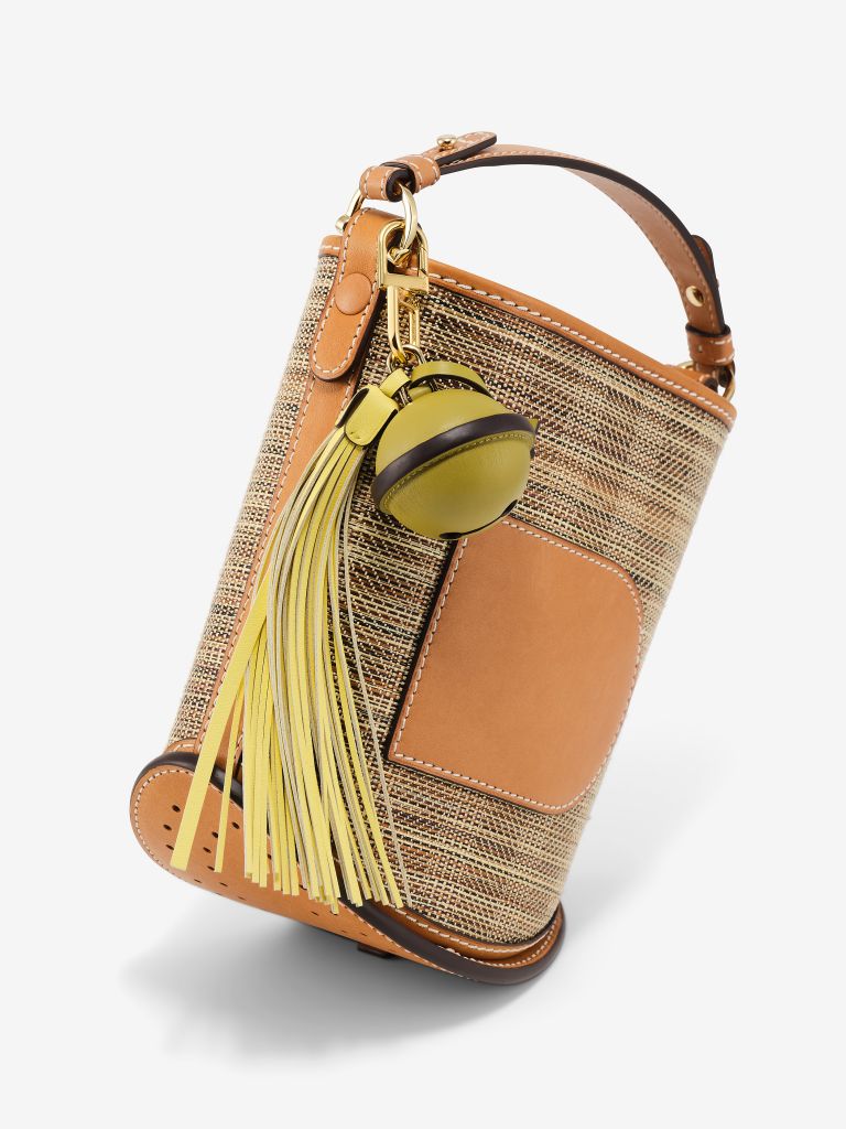 PIN MINI BUCKET手袋底部標誌性微笑曲線,靈感源自馬的糧草袋,線條柔和且富象徵意涵,馬鬃編織工藝演繹馬年PIN MINI BUCKET。鈴鐺吊飾為馬年限定系列注入象徵意義,鈴身以絲滑小牛皮製成,流蘇增添動態感與優雅氣息。