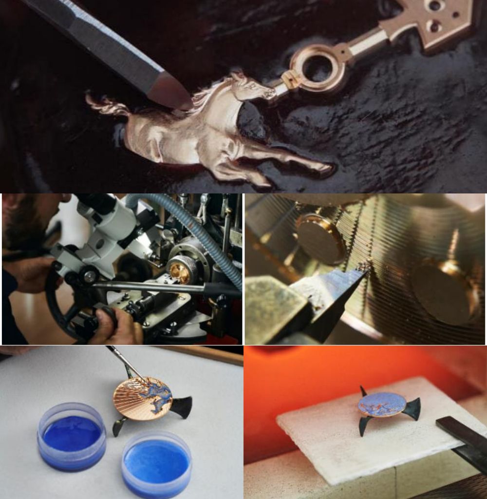 發條盒與錶盤側主夾板皆帶有璣鏤飾紋,手工匠人以傳統刻花車床雕琢而成,運用各種“圓花飾”打造精美圖案。每枚腕表均經手工鐫刻,以大明火琺瑯工藝裝飾,彰顯華貴氣質。腕表提供個性化定制服務,成就獨一無二專屬之作。