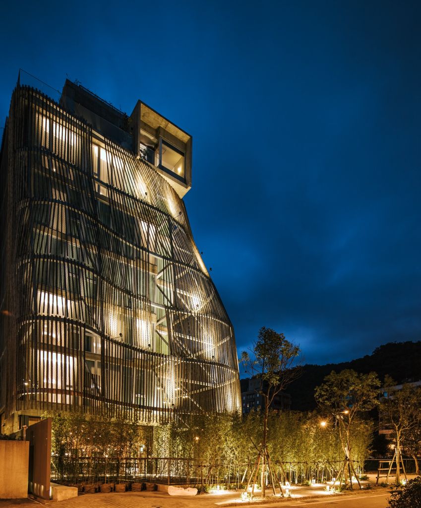 “了了”源自禪學,意指面對萬物變化,仍能保持內心澄澈寧靜。建築本身即是一件藝術品,由自然洋行建築事務所曾志偉操刀,以巨大不規則圓弧形”樹洞”有機體外觀,象徵生命起源與庇護所。建築外觀選用孟宗竹、吸濕調節樂土內牆、台灣原生月桂葉編織盆籃,每項建材與家飾都選用在地或環境友善材料。