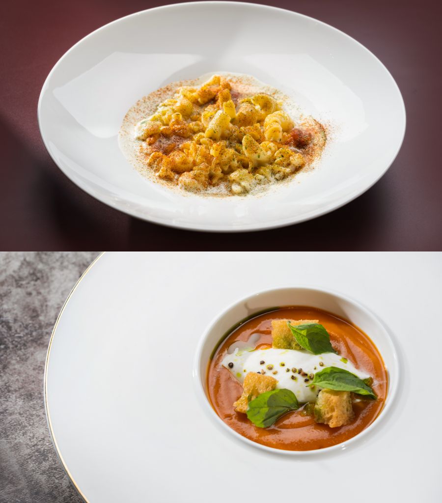 慢燉洋蔥牛肉麵餃佐牛肉清湯、佩科里諾乳酪碎&手工義大利短管麵、酥炸櫛瓜、羅勒、帕瑪森乳酪醬