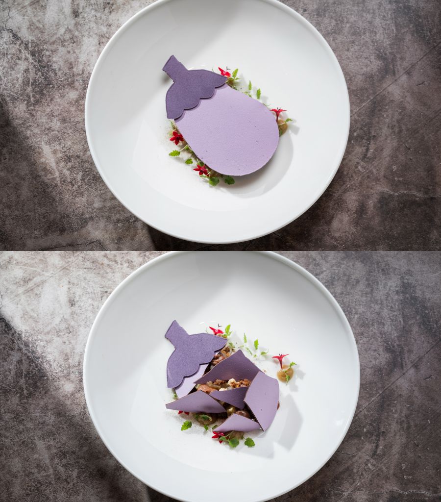 盛裝時先鋪上巧克力慕斯與茄子泥襯底,優雅錯落著糖漬茄子丁及海鹽焦糖茄子,綴上茄子粉、松子碎及掛霜松子添以一抹堅果芬芳,於盤中打造一座精緻迷你蔬香果園,於上精巧覆以茄子造型巧克力片。食用時以湯匙輕敲打碎搭配一同入口,綿軟香甜帶著爽脆口感。