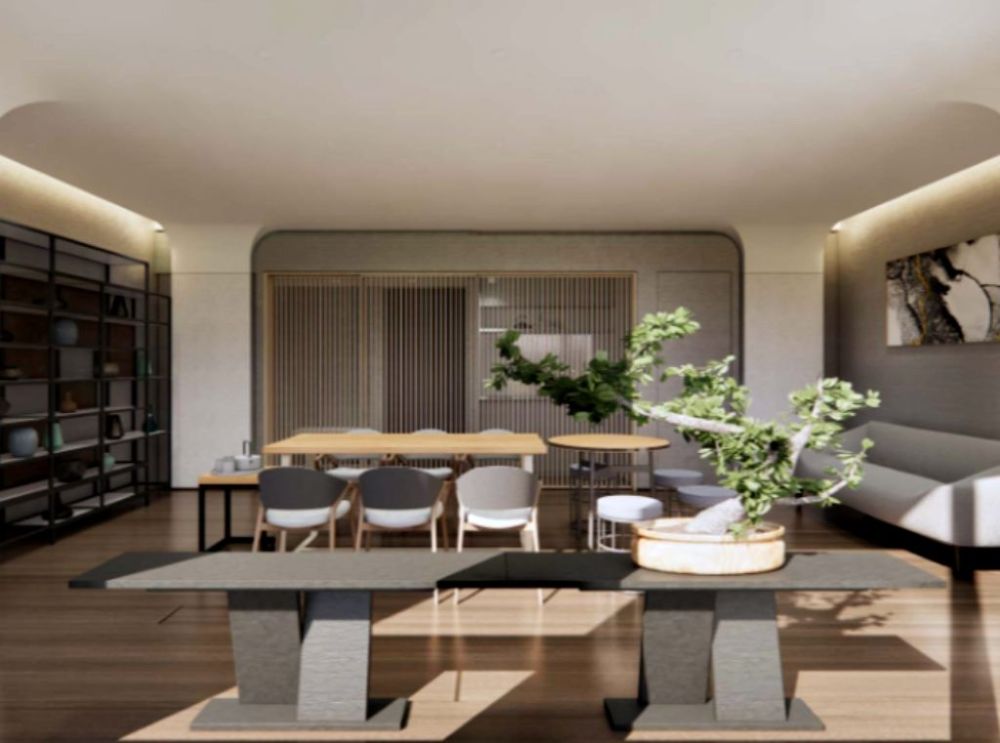 車道上方垂吊的燈樹,象徵陽光穿過林梢;1樓迎賓大廳以雲杉打造,呈現山林參木交錯般結構,牆面以手工塗抹技法創造自然紋理,隱喻山伏修行者穿梭林間行走狀態。
