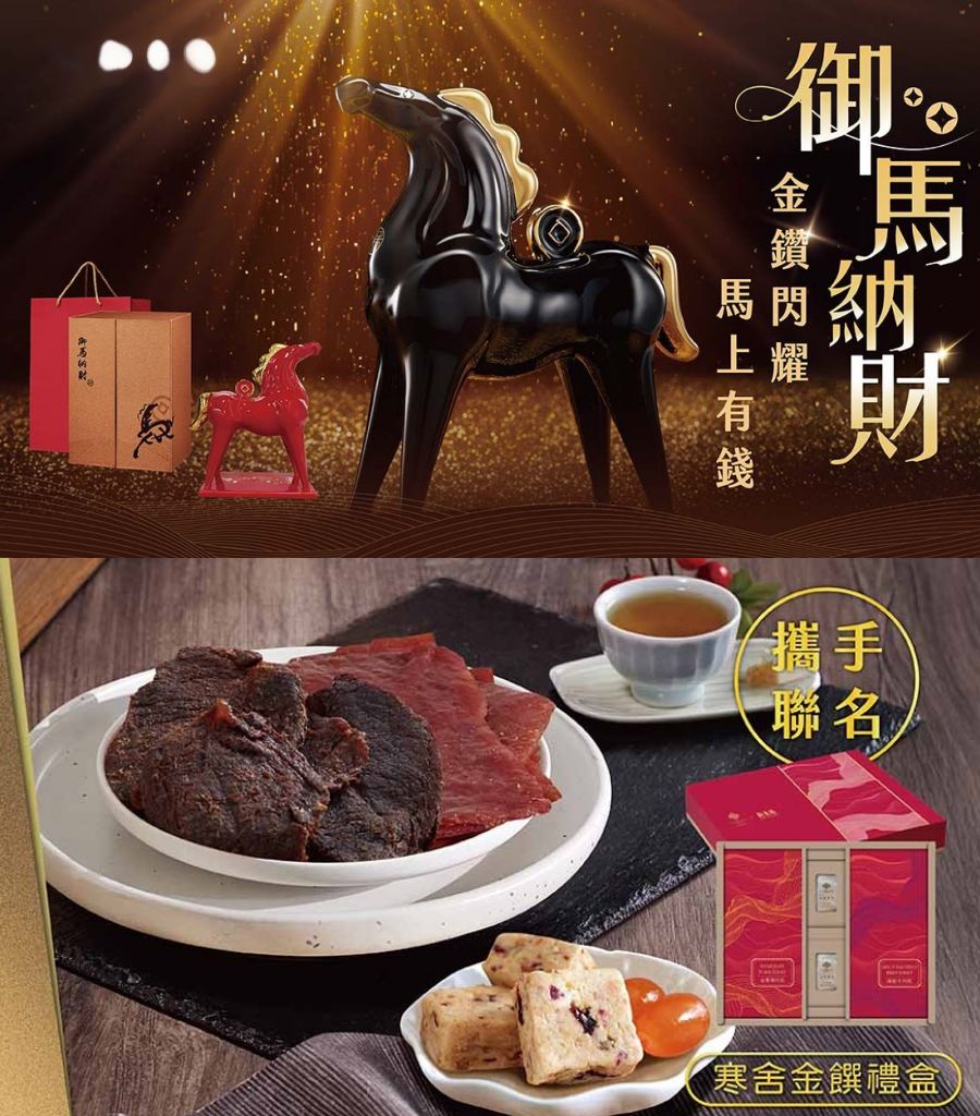 “御馬納財瓷器禮盒”打造象徵馬上有錢黑馬款及寓意馬上發財紅馬款,2款瓷器採高溫燒製工藝,描金勾勒祥馬奔馳英姿,完美融合力量之美與財氣寓意,財運奔騰氣勢非凡。內搭”飛魚卵厚片黑豬肉乾"融合頂級海味、"金錢豬肉乾"口感軟嫩富嚼勁2款極品豬肉乾,從視覺到味覺皆展現層次豐富尊榮享受。