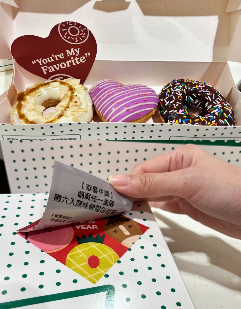 3款期間限定甜甜圈造型可愛、寓意吉祥,獻上"旺馬奔甜"新年祝福,祈願衝勁滿檔、一馬當先。新年限定禮盒一次品嚐3種開運甜甜圈,還能搭配任選口味自由組合。農曆春節期間隨盒附贈限量斗方抽獎券,開盒有喜、多種優惠券馬上中獎。