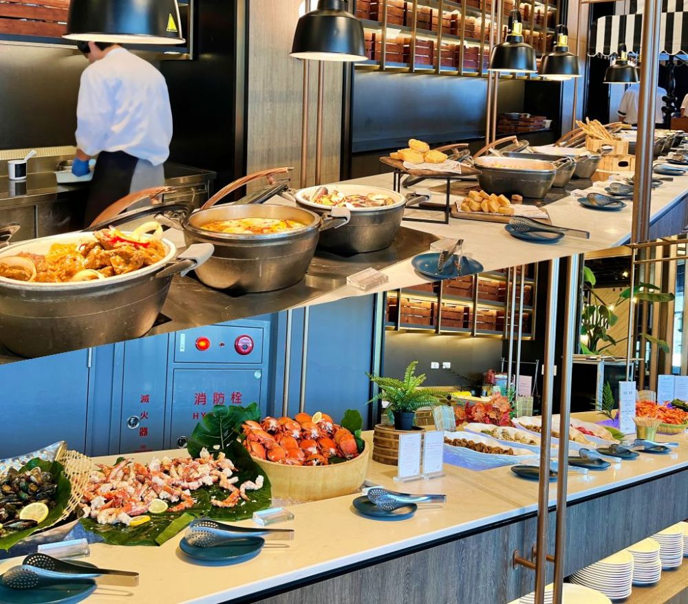 “集鮮.碼頭"提供3種螃蟹、鮮蝦、貝類等冰鎮海鮮,假日餐期加碼無限供應鮮甜飽滿雪蟹腳及肉質細緻毛蟹腳無限享用,主廚特色海鮮料理佃煮槍烏賊、五香燻魚,彷彿置身海濱漁港,品嚐新鮮食材純粹風味。