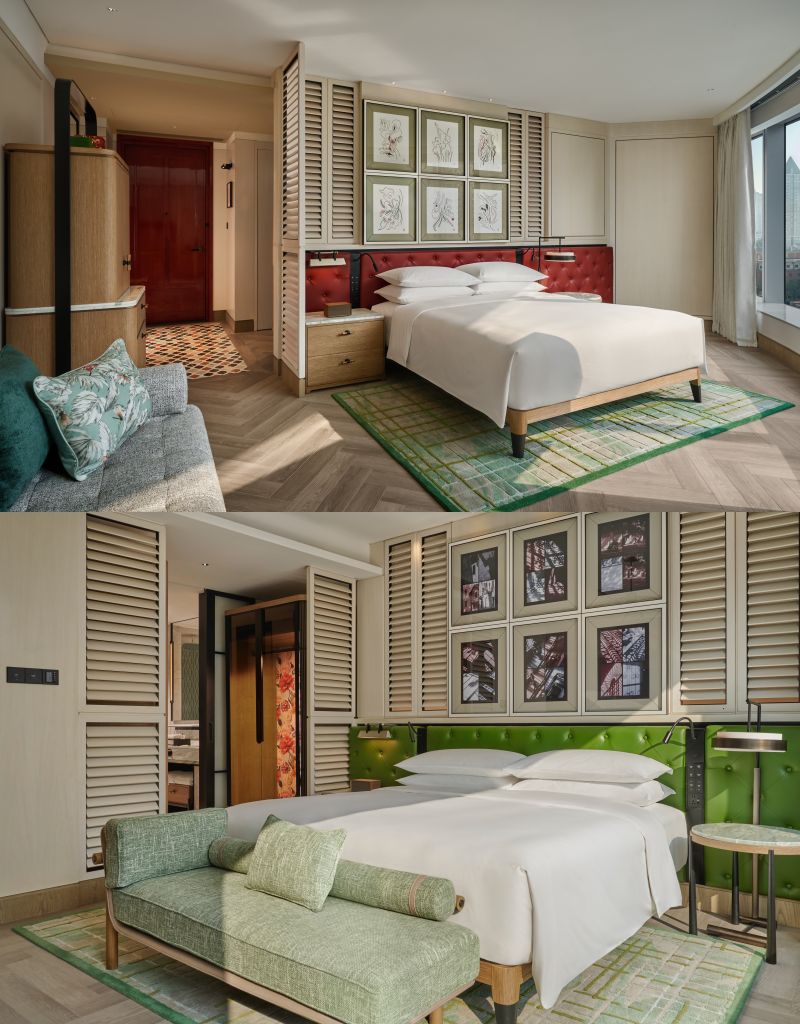 整體客房設計理念採用住宅風格,從走廊開始便融入上海弄堂鄰里梧桐樹剪影,營造私密舒適住宅式居住體驗。每間客房門設計均不同,突顯居家氛圍;室內格局參考複式住宅概念:獨立式衣櫃巧妙銜接衛浴空間,立體瓷磚牆面營造如家般私密氛圍。