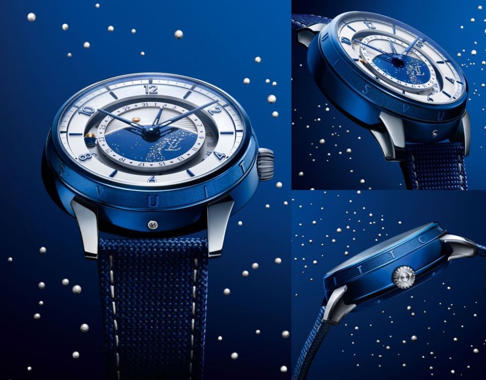 錶盤重新演繹經典天體語言”星空圖”,外圈為球體造型日夜指示,以專利球體月相結構為基礎,選用5N玫瑰金與火焰藍化鋼材,乳白色錶盤表面強化易讀性並呈現微妙光影效果。藍色布料錶帶搭配灰色縫線呈現現代感科技氛圍。超柔軟干邑色鱷魚皮錶帶搭配同色調縫線,呈現經典雅致質感。採用拋光藍色鈦金屬針式錶扣,扣舌刻有LV/DE BETHUNE標誌。