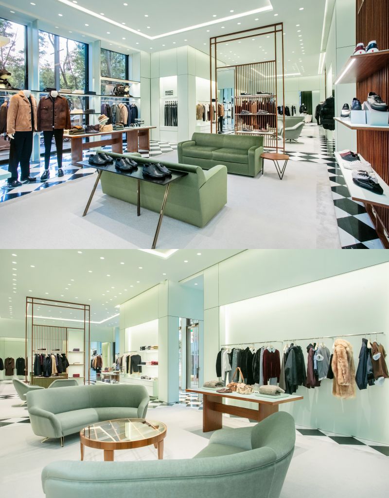 店內空間延續標誌性元素,採用靈感源自米蘭艾曼紐二世迴廊創始店經典黑白大理石格紋地板。綠色布面牆面以黑色金屬線條框構出牆面陳列空間,木質屏風營造更私密專屬區域。而檀木邊桌、天鵝絨座椅及米色地毯成就整體設計,為空間注入暖意與歡迎氛圍。