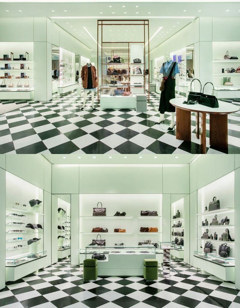 全新專門店面積超過600平方米,展示全系列女士與男士服裝、皮件、鞋履及首飾配件商品,並呈現最新2026春夏系列產品與PRADA ETERNAL GOLD高級珠寶系列。外觀由超過600平方米PRADA三角形圖騰縱橫交錯,搭配能夠俯瞰室內大面積透明玻璃櫥窗,彰顯獨到建築語彙。