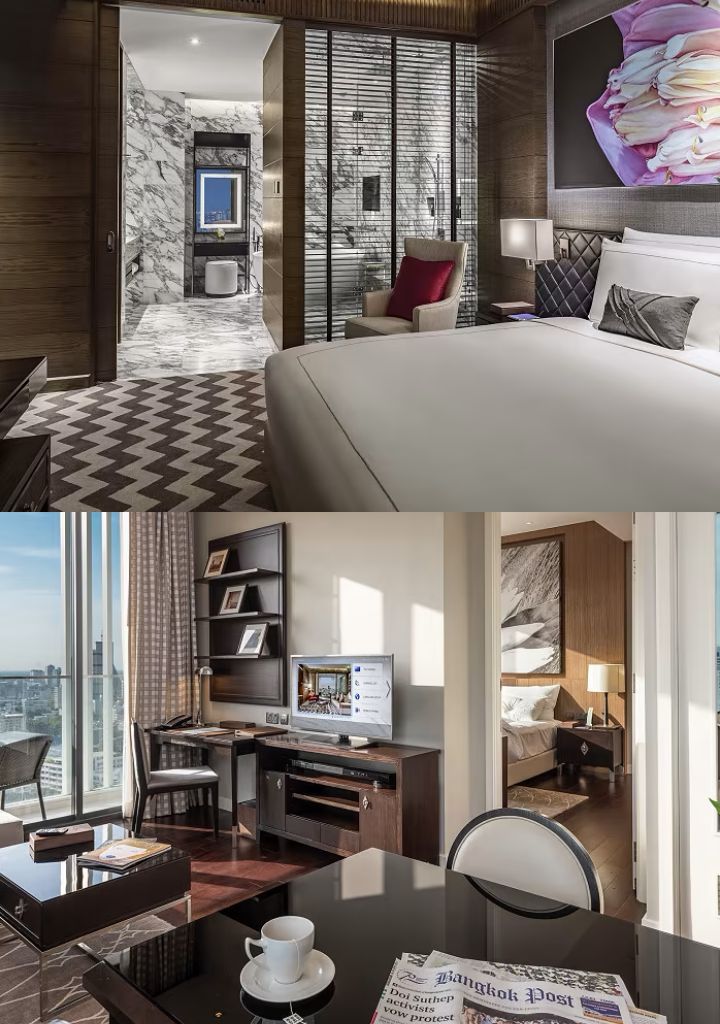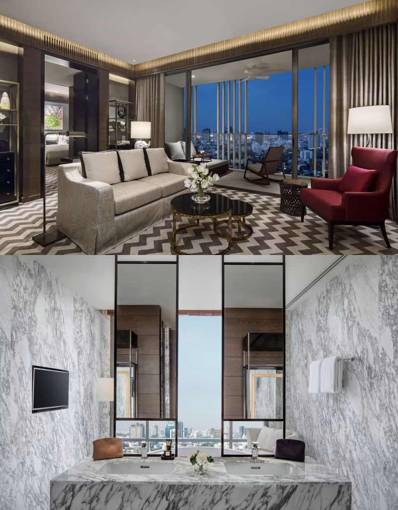 SUITE豪華套房以泰國歷史上偉大的皇家時期命名,分為SUKHOTHAI、AYUTTHAYA、THONBURI、RATTANAKOSIN四個類型,擁有挑高天花板及開闊視野,設有起居室、步入式衣櫥(WALK-IN CLOSET)及餐桌區,並配備寬敞大理石浴室、露天陽台及24小時私人管家服務。