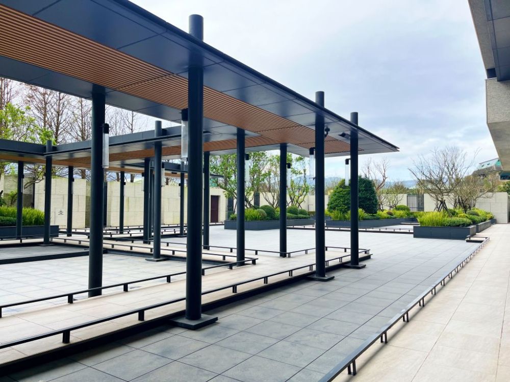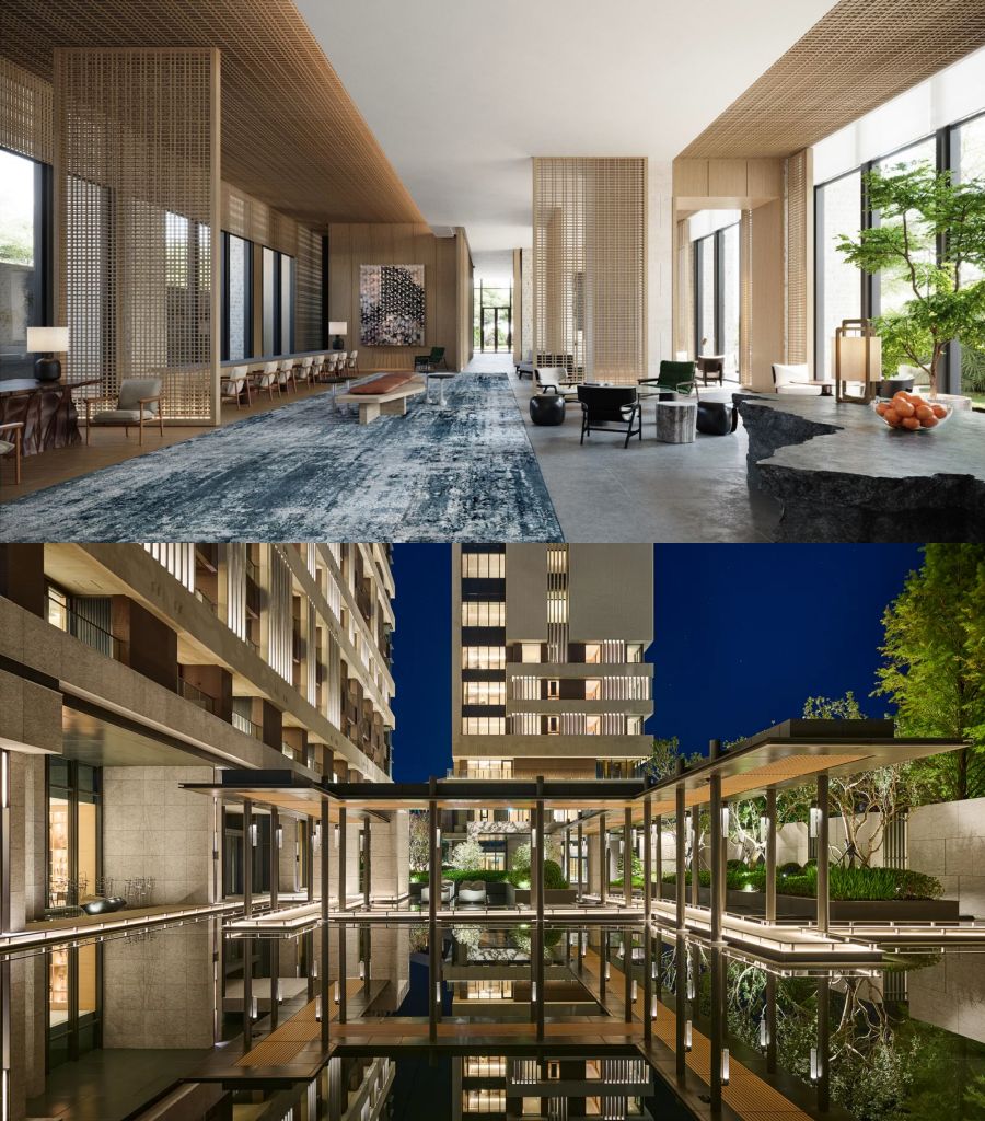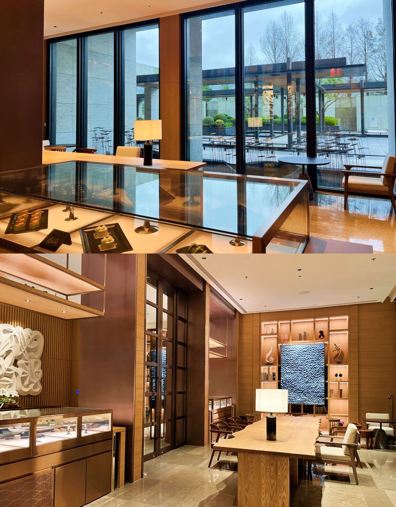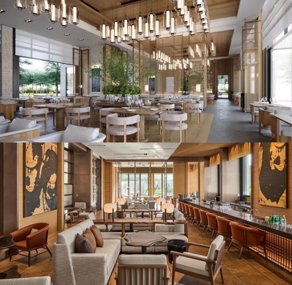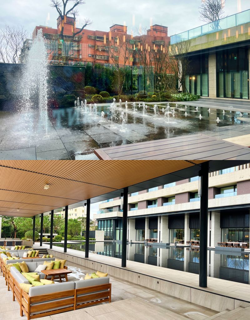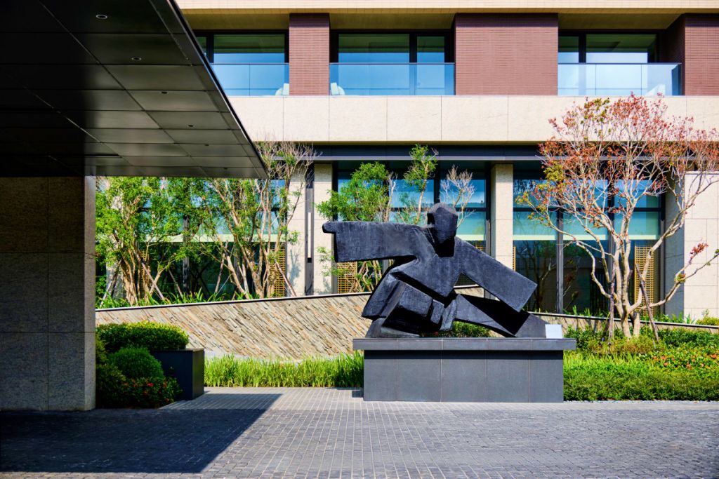 入口處朱銘太極系列雕塑作品「單鞭下勢」以沉穩力道定錨凝結金山自然氣韻,連動北海岸在地蹦火仔捕魚、老梅石槽意象的景觀。”燈光詩人”賴雨農以光線化作畫筆,編織氤氳霧氣流動於空間肌理,在光影流轉中充滿離塵般靜謐愜意,書寫一場極致奢華敘事。