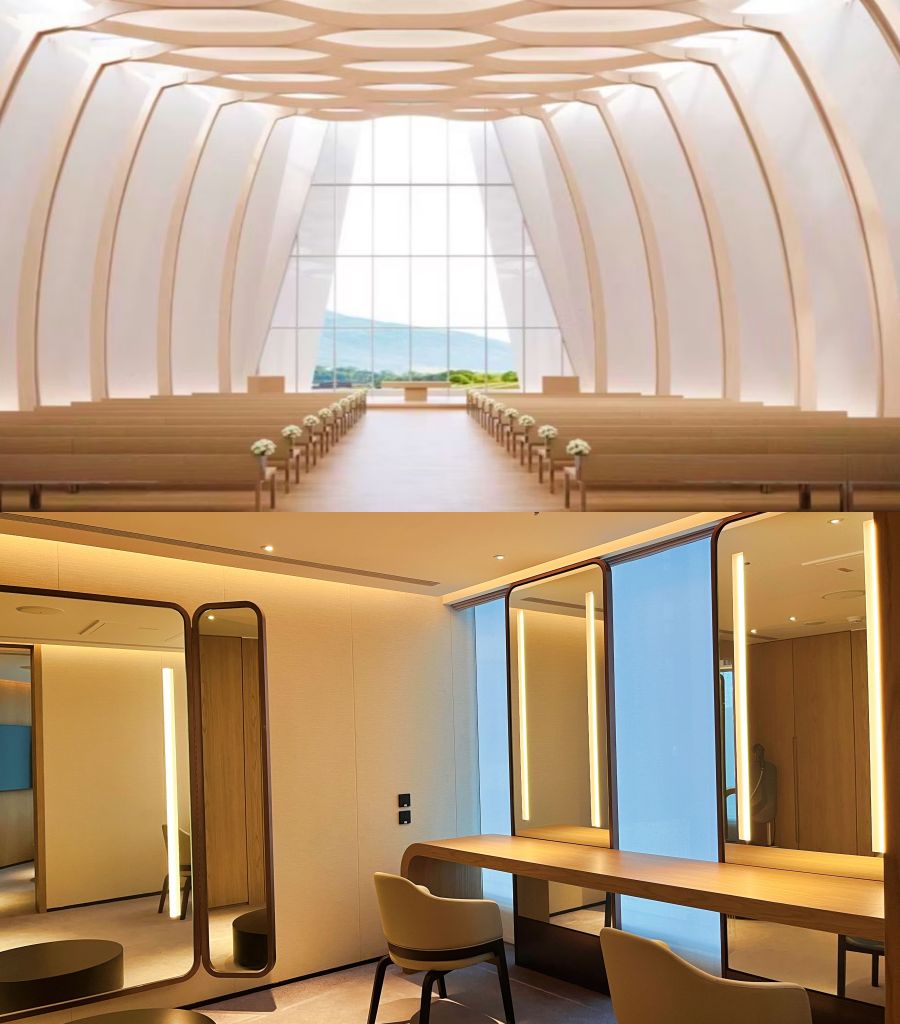 CHAPEL泉曦教堂純淨奢華設計,挑高純白結構與層疊布幔交織,在織品紋理間構築出純淨舞台。弧形拱頂與落地窗引入金山絕美山景,純白畫布以鏡面映照藍天,日光灑落與自然相融,將自然天光轉化為柔和濾鏡,成為一座隨時間推移而變幻的藝術場域。鄰近花園露臺,私密優雅。