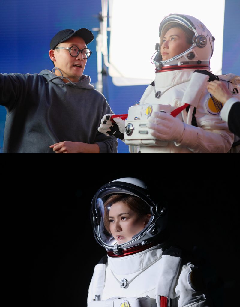 本次影像拍攝採用超高清LED Volume虛擬攝影棚建構太空場景,透過高解析度弧形LED投幕與即時渲染技術,讓宇宙光影在現場真實反射於太空服。俯衝段落結合AI動態生成影像與數位合成技術,營造突破平流層沉浸式既視感。科技成為場景的延伸,而情感始終是核心。〈飛瀑而下〉是在城市與宇宙之間,確認自己仍然完整的那一刻。