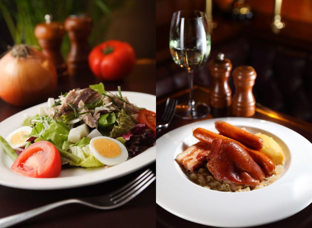 優雅午宴以雙人共享形式設計,涵蓋前菜沙拉、主廚特製湯品、主餐及巴賽麗廳特製甜點完整套餐,以時令之味增添暖心一筆。"La Choucroute阿爾薩斯燉豬腳”以燉豬腳佐阿爾薩斯酸菜與香腸,口感層次豐富,呈現法國大東北經典風味。