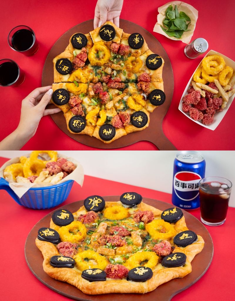 整圈帶有醇厚可可香氣OREO整齊鋪在芝心餅皮外圈,內裡是滿滿口感牽絲、香味濃郁莫札瑞拉起司,看似反差的鹹甜組合卻是成就”黑脆可可起司餅皮”最佳拍檔。OREO餅乾台味鹹酥雞比薩既有鹹酥雞經典台味,亦有OREO甜香酥脆,大口爽吃炸物也滿足甜點胃;2大經典創意結合,一口接一口停不下來。