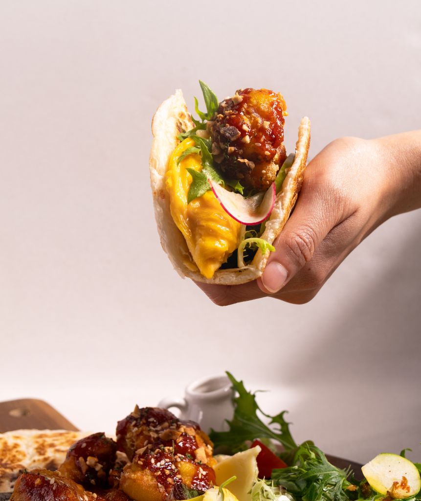 “韓式辣炸雞早餐盤"將酥香炸雞與韓式辣醬的微辣層次,搭配醋漬白蘿蔔、滑嫩炒蛋與青蘋果沙拉,再包入印度烤餅享用。熟悉的味道,在早午餐的形式裡變得更輕盈,也更適合一天的開始。