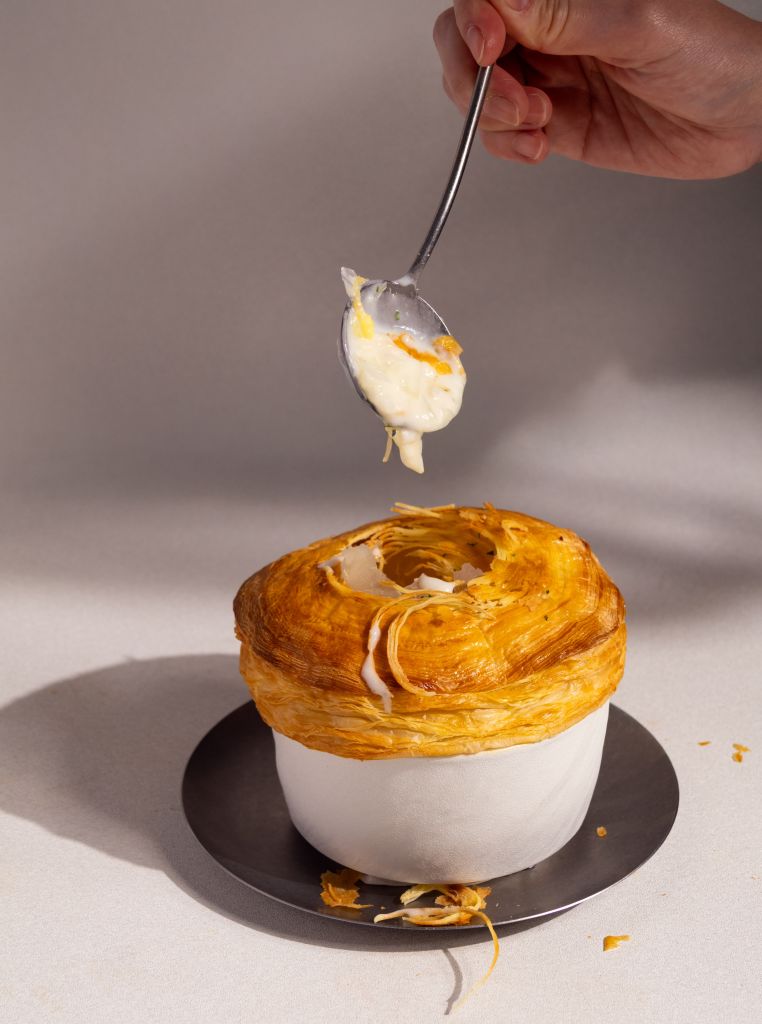 “漬葡萄奶油起司酸種麵包"以蘋果醋漬脆葡萄、北海道奶油起司與君度橙酒交織清爽果香,在鹹與甜之間取得細緻平衡。