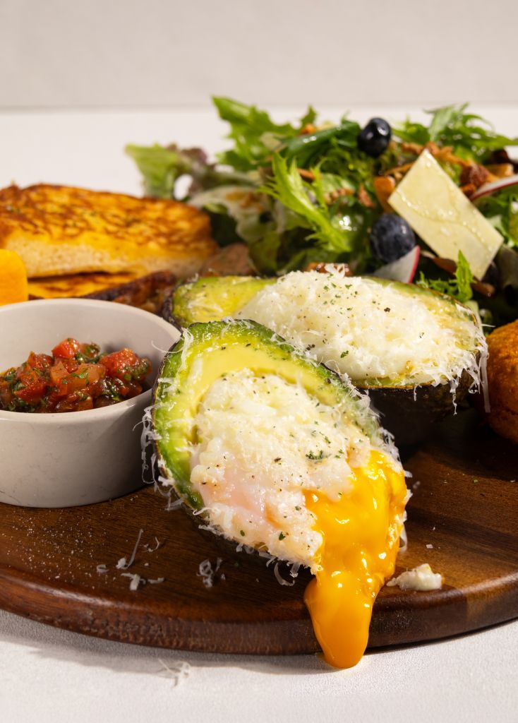 “法式吐司與整顆酪梨蛋早餐盤"以整顆酪梨為中心,鹹法式吐司、自製起司薯絲餅與綜合沙拉構成完整早午餐,配上1杯LITTLE TREE JUICE CLUB小樹果汁,讓餐桌顯得明亮有節奏。