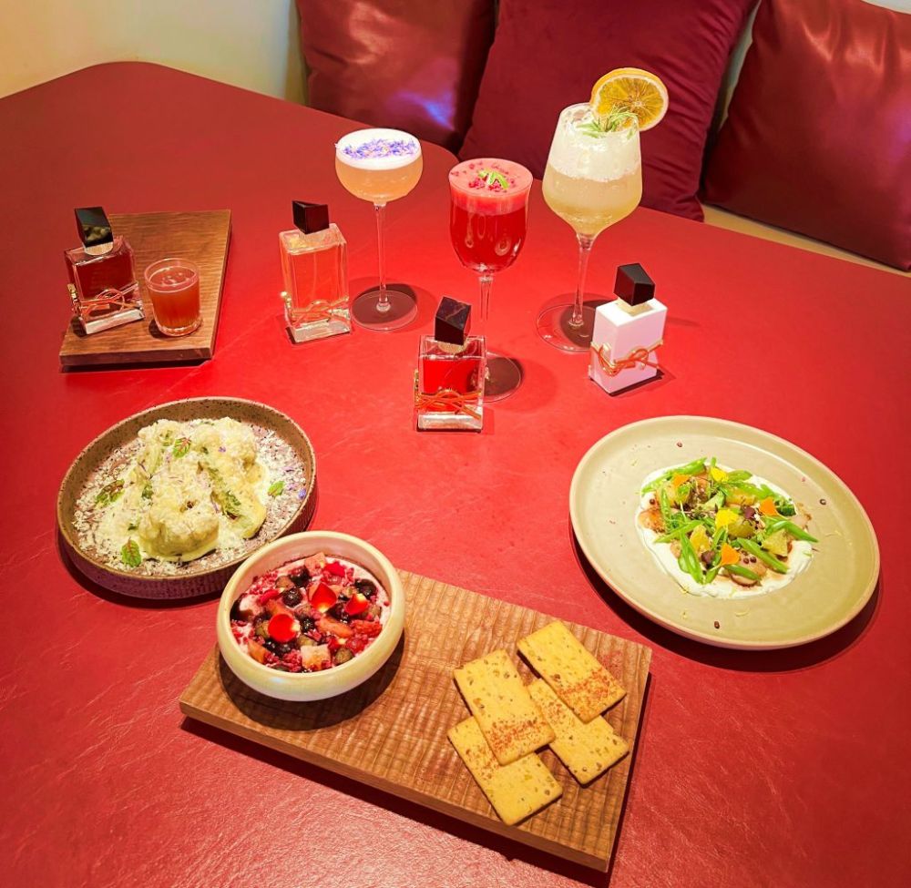 柑橘明亮氣息轉化為前菜沙拉的清新果香與輕盈口感;薰衣草與橙花細緻花香成為天婦羅料理的優雅香氣線索;覆盆莓甜美尾韻延伸為甜點與調酒靈感來源,賓客能從不同風味中,感受香水與料理的感官連結。