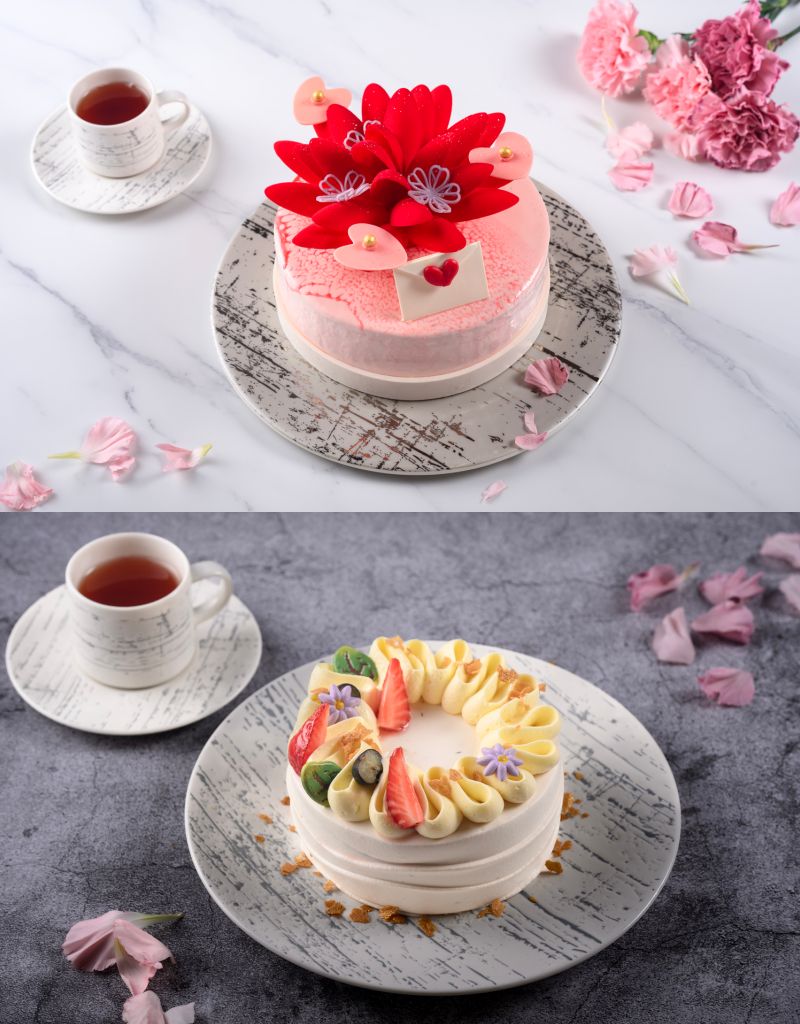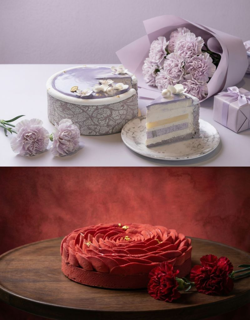 “VIOLET GRACE紫韻"蛋糕以天然無咖啡因富含抗氧化國寶茶慕斯為主調,融合紫薯戚風、滑順布丁與綿密芋泥,層層堆疊溫潤輕盈細緻口感,溫潤木質香氣中和甜度。"RED ELEGANCE緋華"蛋糕以盛開玫瑰結合RUBY紅寶石巧克力與覆盆子交織純天然果香,搭配酥脆杏仁塔殼與玫瑰慕斯,酸甜濃郁絕佳平衡口感,溫潤綿密優雅不凡。