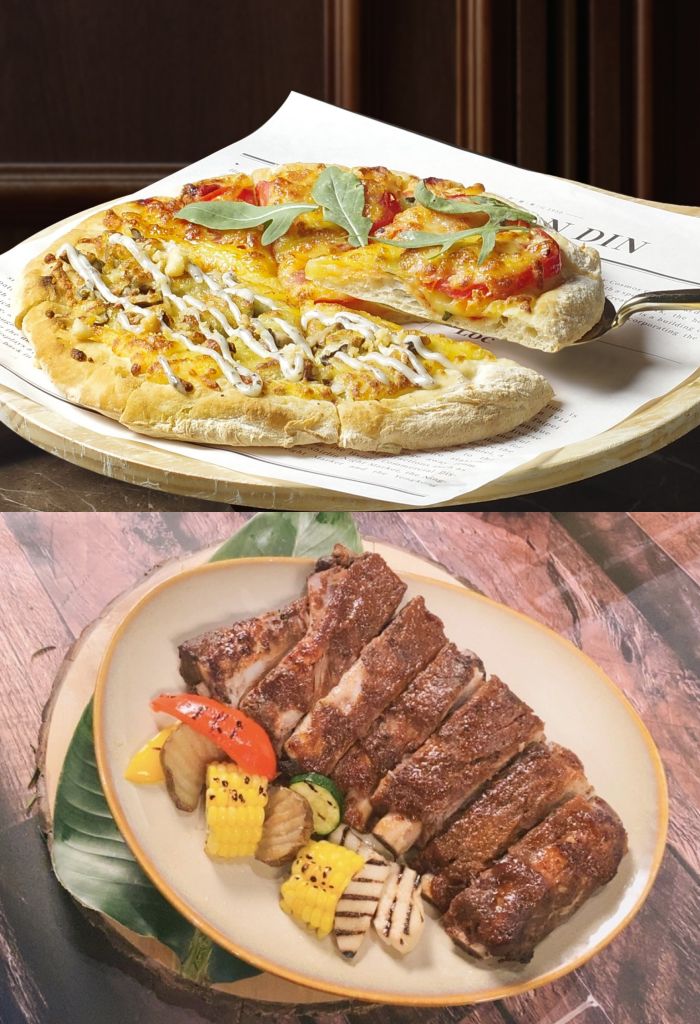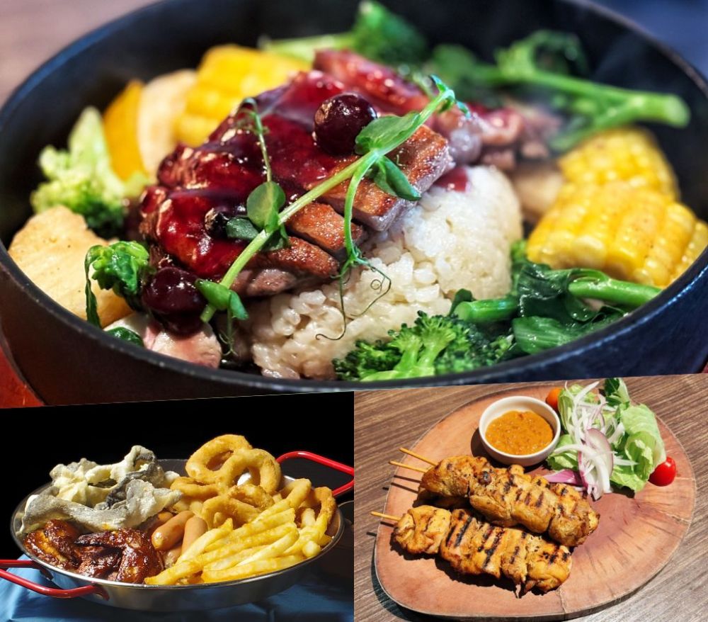 6人分享餐道道經典,任選3道下酒小菜,2種口味雙拼風味披薩及義式香料紙包烤魚外,還包含炙燒松阪豬女婿蛋沙拉、沙嗲雞肉大串串、炸物拼盤、炙燒櫻桃鴨胸飯、大力金剛腿及炙燒鮭魚火山卷,口感層次豐富,香氣四溢風味迷人。