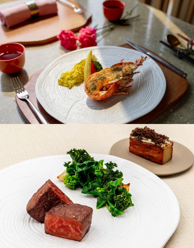 雍翠庭母親節套餐主菜”明太子烤活龍蝦”以鮮甜彈嫩活龍蝦結合濃郁明太子醬,風味層次豐富。歐陸餐廳精心獻上"澳洲純血M9和牛肋眼佐馬德拉醬汁",嚴選油花細緻均勻澳洲和牛肋眼,搭配帶堅果與焦糖香氣馬德拉醬汁,展現濃郁飽滿口感。
