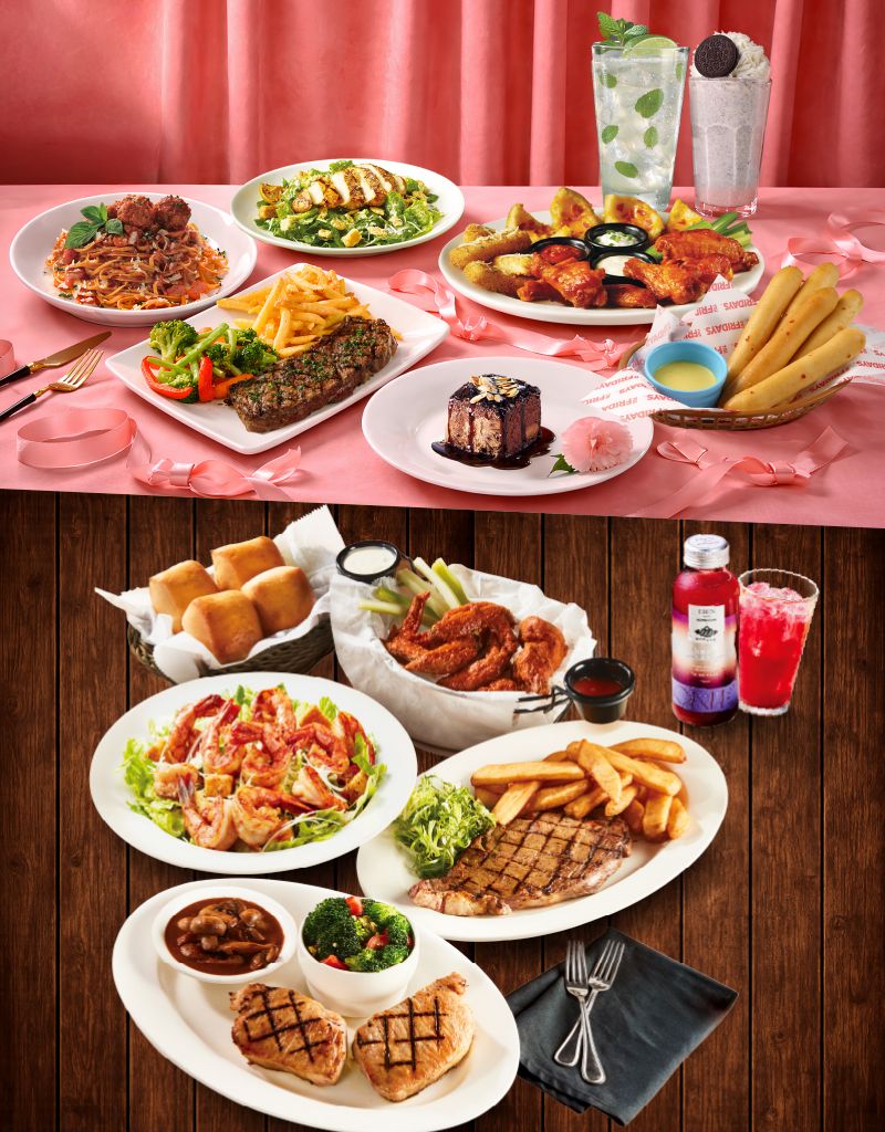 TGI FRIDAYS雙人/4套餐包含沙拉、開胃菜、飯麵主餐、火烤主食、甜點及無酒精特調飲品。2人套餐提供主餐升級選項,沙朗牛排加價升級為肋眼牛排,豐盛美饌輕鬆升級。