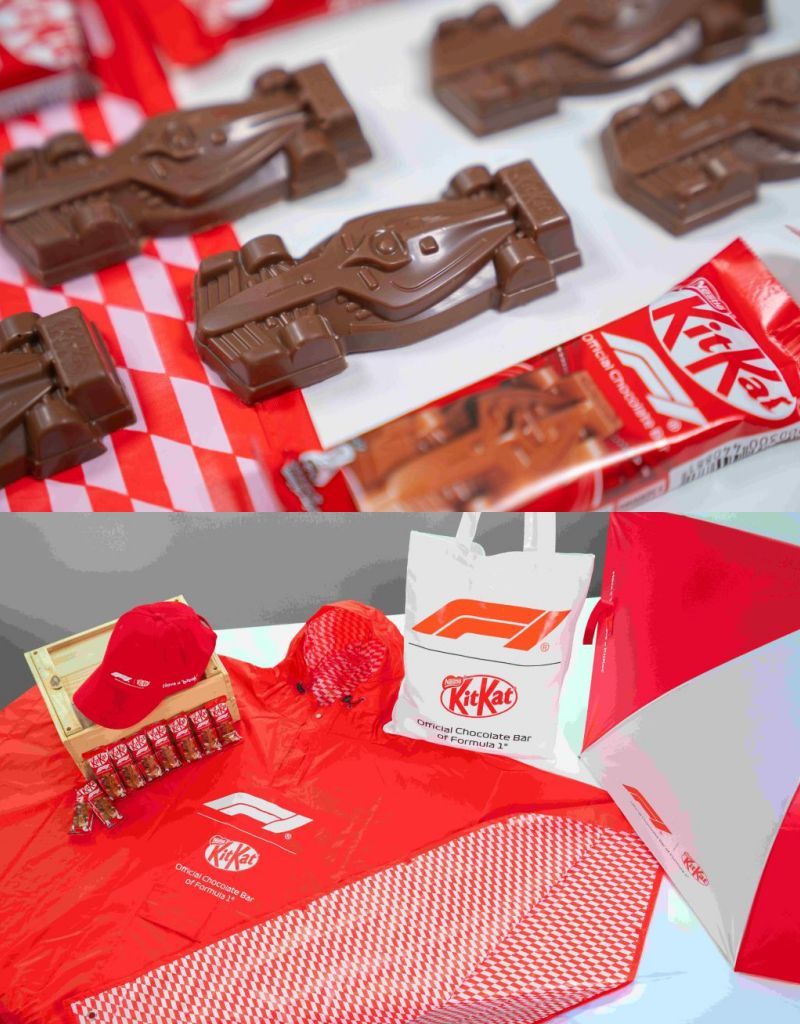 雀巢KITKAT還將F1精神帶入日常生活,祭出造型雨傘、賽車斗篷雨衣與托特包等多款F1限量聯名贈品,隨時隨地都能展現熱血賽車魂。官方更打造一輛實心巧克力賽車,全車身以純巧克力按照F1賽車真實尺寸打造,光製作時間就超過1,254小時,使用的巧克力量約等於16,900條KITKAT。