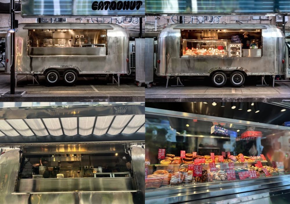 EATDONUT以2台露營車為核心設計,打造城市中小型營地外帶店型,沒有制式櫃位與封閉空間,而是以更開放輕鬆形式存在於街角,在街頭就能感受輕鬆氛圍,背景搭配塗鴉藝術家DWANG經典標誌三眼怪,打造城市甜點場景。