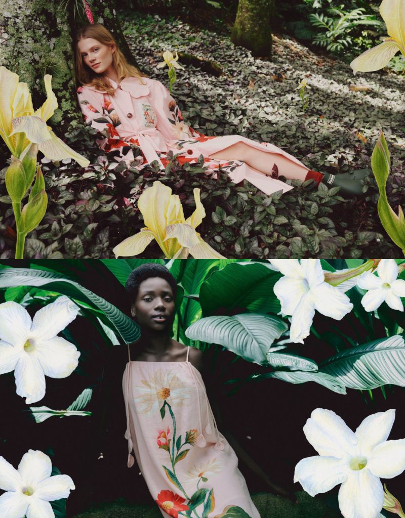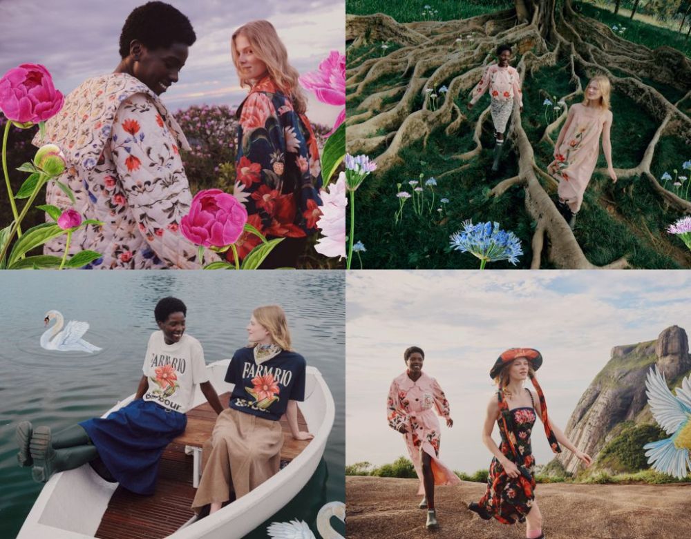 本季系列以WHERE BRAZILIAN VIBRANCE MEETS BRITISH COUNTRYSIDE(巴西鮮活色彩與英倫鄉間風景交會)為概念出發,從2種自然景致中汲取靈感,將英國鄉間花園常見野花雛菊與矢車菊,透過FARM Rio手繪印花重新詮釋。